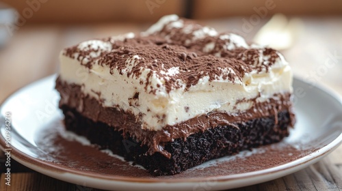 Close-up of a decadent chocolate brownie cake topped with cream cheese, served on a plate. Homemade sweet dessert, high angle
