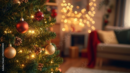 christmas, tree, ornament, pine, cone, gold, red, fireplace, couch, pillow, festive, decor, holiday, celebration, winter, season, light, cosy, home, living room, interior, background, bokeh, blur, warm, sparkle, joy, cheer, happiness, family, togetherness, tradition, magic