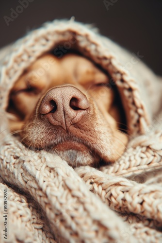 dog, sleeping, blanket, cuddled, face, nose, whisker, pet, cosy, warm, comfort, soft, knit up, closeup, brown, fur, animal, canino, peaceful, rest, relaxation, sleepy, nap, cuddle, home, love, care, lover, furry, friends, welfare, safety, health, owner, supply, accessory, gear, product, portrait