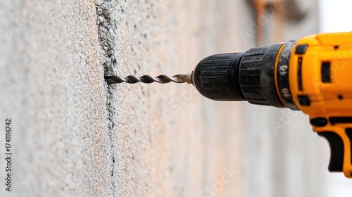 Close-up of a drill boring into a concrete wall, showcasing construction work in an urban environment