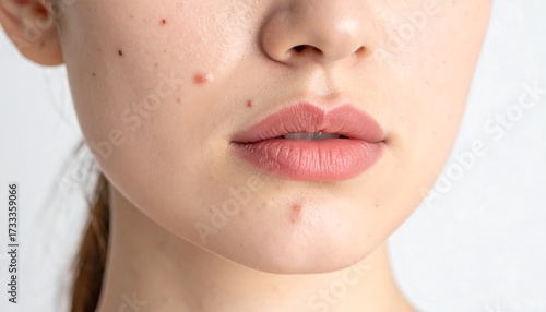 Close-up of a fair-skinned person's lower face, highlighting the lips, nose, and areas with blemishes. The lighting is soft