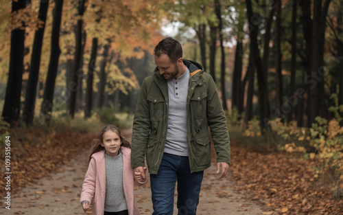 Close-up of a father and daughter enjoying a walk in an autumn forest, sharing a fun moment outdoors together.
