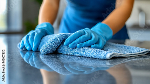 Close-up of a female cleaner's gloved hands in action, symbolizing hard work, cleanliness, and diligence. The image highlights the dedication and care involved in maintaining cleanliness and order
