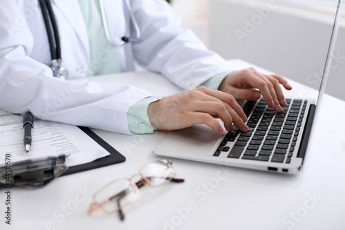 Close-up of a female doctor typing on laptop computer, sitting at the table in the hospital