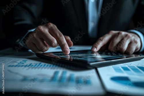 Close-up of a financial analyst's hands working on a calculator while reviewing graphs and charts on statistical reports.