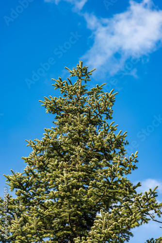 Close-up of a fir tree, spruce, on a clear blue sky with clouds, Italian Alps, Trentino Alto Adige, Italy, south Europe