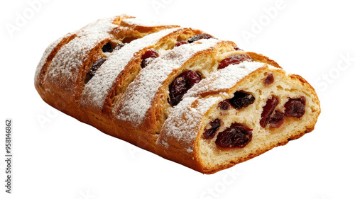 Close-up of a freshly baked bread loaf with icing sugar and dried fruits, sliced and ready to serve. Perfect for baking, breakfast, and dessert concepts.