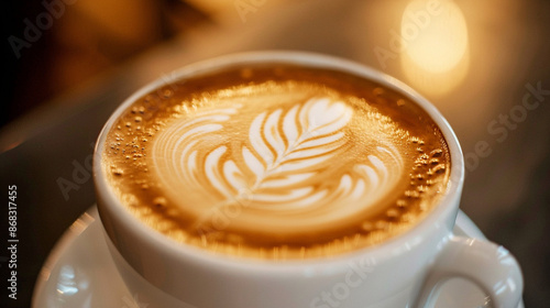 Close-up of a frothy cappuccino in a white ceramic cup with latte art