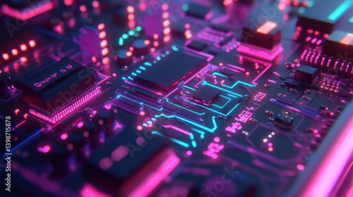 Close-up of a futuristic circuit board with neon lighting.