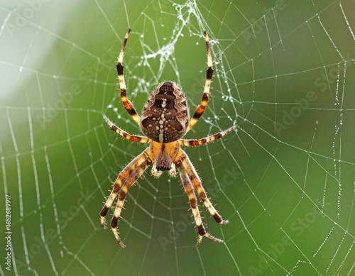 Close-up of a garden orb-weaver spider on its intricate, dew-covered web, highlighting its unique patterns and natural habitat. A detailed view of an arachnid in its element
