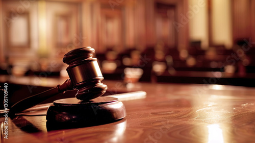 Close-up of a gavel resting on a wooden desk, symbolizing legal victory, justice, and courtroom decisions. Concept of law, authority, and judicial system in action.