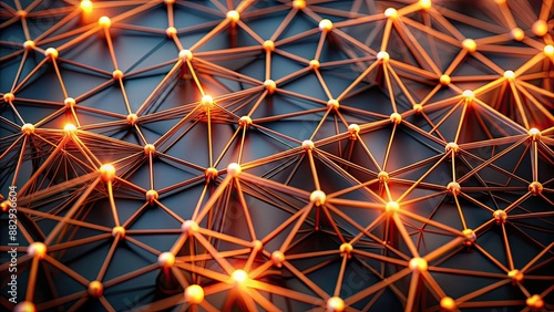 Close-up of a geometric surface with glowing orange nodes, geometric, abstract, surface, interconnected, triangular, facets