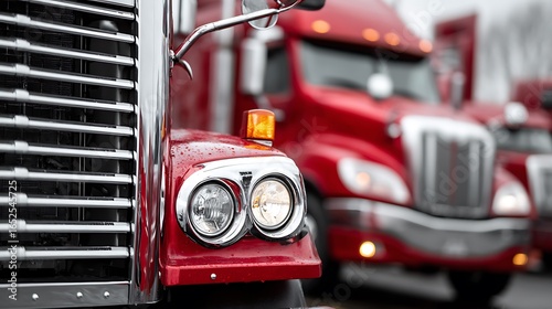 Closeup of a gleaming red semitrucks chrome details, powerful engine visible. Other red trucks are blurred in the background. .