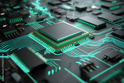 Close-up of a glowing microchip on a circuit board, highlighting intricate electronic pathways and components in a futuristic technology setting