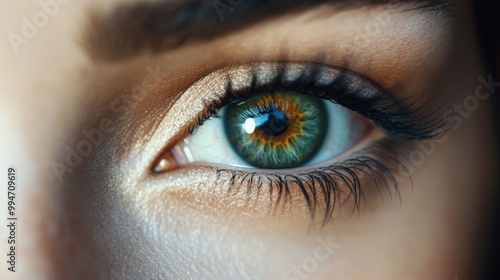 eye, green, gold, glistering, eyeshadow, macro, eyelash, iris, pupil, eyebrow, skin, beauty, make-up, cosmetic, shimmer, sparkle, bright, vibrant, detail, sharpened, soft, delicate, feminine, elegant, natural, light, shadow, human, face, look, gaze, vision, perception