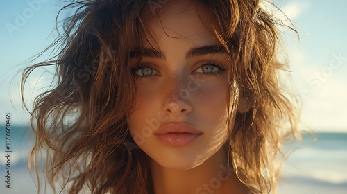 Close-up of a hair model’s beach waves, soft curls framing her sunlit face, ocean waves and sandy beach blurred in the background, focus on the natural, relaxed texture and sun-kissed highlights,