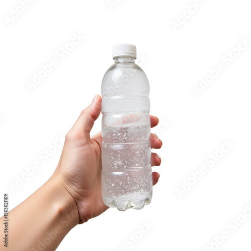 Close-up of a hand holding a plastic water bottle with droplets on a black background, showcasing the bottle's details and condensation, modern hydration concept..