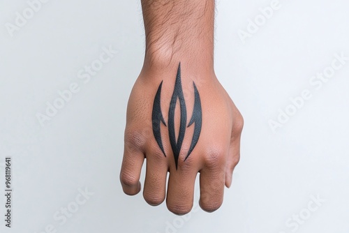 Close-up of a hand with black flame-like tribal tattoo design, isolated against a plain white background. Perfect for showcasing tribal tattoo concepts, body art designs, and modern ink styles.
