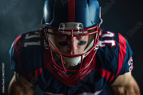 Close-up of a handsome American football player in full uniform, showcasing a muscular physique and intense gaze in an action pose.