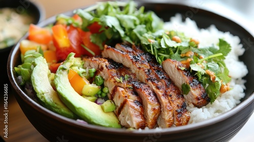Close-up of a healthy Buddha bowl featuring baked pork, rice, avocado, and a vibrant vegetable salad, perfect for wellness themes.