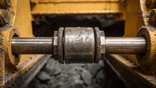 Close-up of a heavy machinery component, showcasing a metallic bearing surrounded by dirt and dust in an industrial setting.