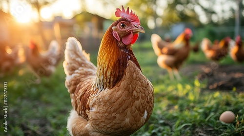Close-up of a hen in a farmyard at sunset, with other hens and a fresh egg.