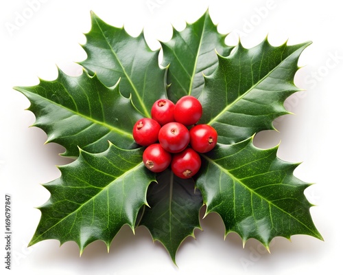 Closeup of a holly sprig with red berries and sharp green leaves isolated on white background