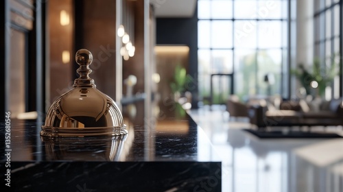 Close-up of a hotel reception desk with a bell on top, the modern and luxurious interior design of the lobby.