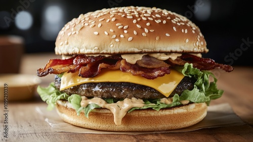Close-Up of a Juicy Cheeseburger with Melted Cheese, Fresh Lettuce, Crispy Bacon, and Flavorful Sauce, Set Against a Dark Background for an Appealing Food Image