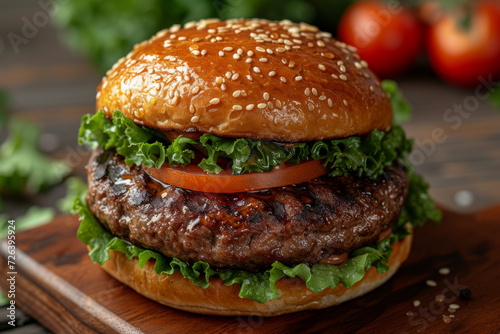 Close-up of a juicy grilled burger topped with fresh lettuce, tomato, and a glossy sesame seed bun, epitomizing the perfect homemade meal