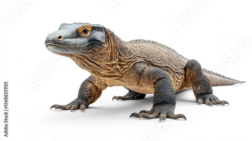Close-up of a Komodo dragon on a white background showcasing its detailed scales.