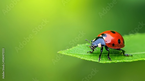 Close-up of a ladybug on a leaf with blurred natural green background. Copy space.