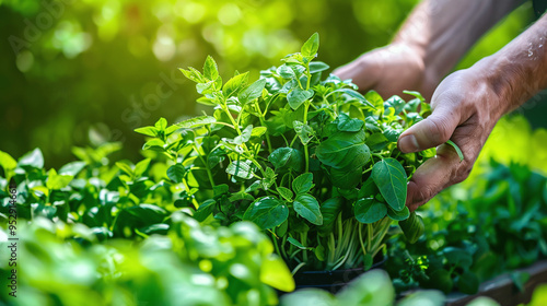 close-up of a man harvesting fresh herbs from a kitchen garden for vegan cooking