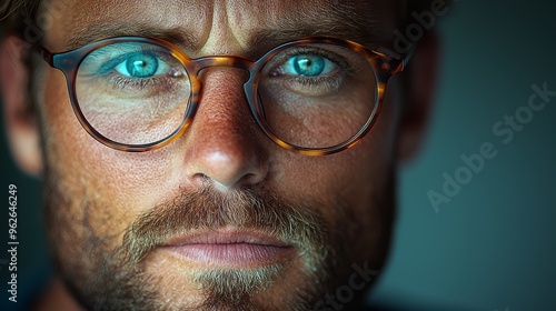 Close-up of a man with striking blue eyes and glasses, showcasing intense expression and facial details in low light