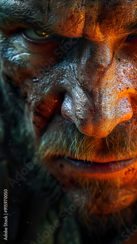 face, man, male, angry, expression, emotion, intense, eye, green, gaze, stare, beard, facial, hair, skin, wrinkle, line, texture, scratch, mark, blood, red, bruised, rough, grimace, teeth, dark, dramatic, portrait, gritty, fear, menacing, fierce, wild, rugged