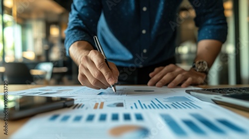 hand, pen, chart, datum, analysis, financial, business, graph, report, strategy, growth, investment, market, statistic, number, trend, research, planning, decision, success, office, desktop, laptop, work, meeting, document, blue, man, arm, wrist, watch, paper, table, desk, closeup, sharpened, blur