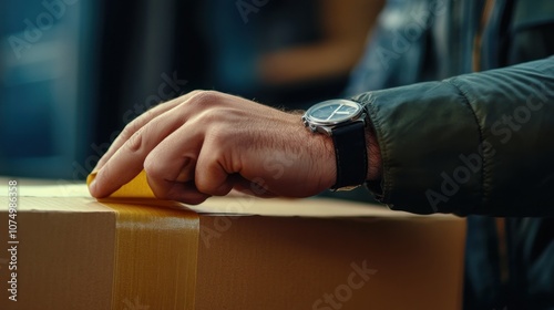 hand, box, cardboard, tape, sealing, package, shipping, delivery, man, finger, wrist, watch, brown, yellow, cardboard box, closeup, detail, object, work, task, business, commerce, logistic, prepare, labor, service, client, order, product, shipment, material, adhesive, secure, seal, close, protect, retail, industry, supply, chain