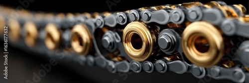 Close-up of a metal chain with golden rollers, showcasing precision engineering and mechanical design elements in an industrial setting