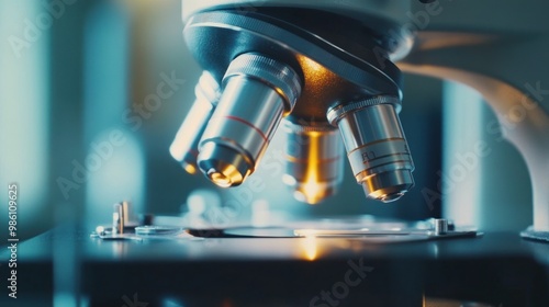 Close-up of a microscope, highlighting its lenses and stage for scientific observation.