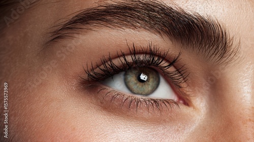 Close-up of a model's eye with long, voluminous lashes, captured in sharp lighting perfect for eyelash enhancement and beauty product promotion.