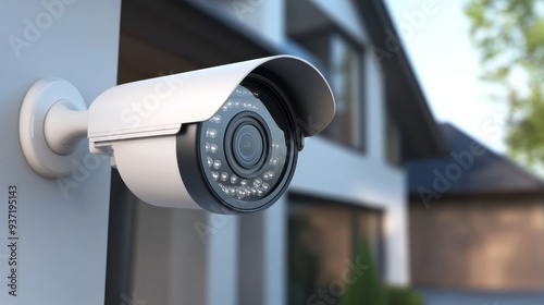 Close-up of a modern security camera installed on a wall, providing surveillance and protection for residential property.