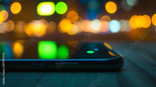 Close-up of a modern smartphone with a battery indicator showing full charge, placed on a wooden table. The background is softly blurred, focusing on the device's safety features