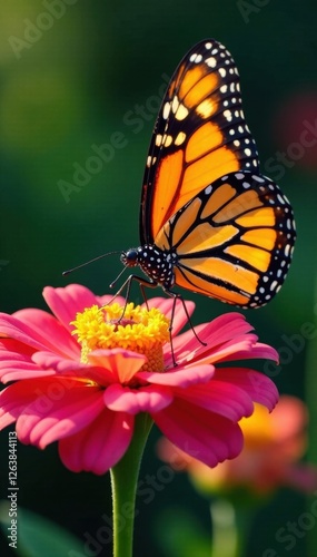 Close-up of a monarch butterfly sipping nectar from a zinnia flower, monarch butterfly, nature, zinnia
