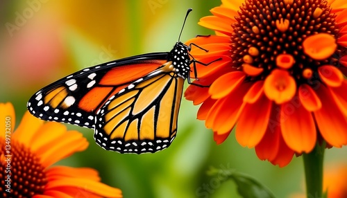 Close-up of a Monarch Butterfly with Intricate Wing Details on Vibrant Orange Flower