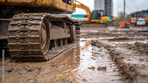 Closeup of a muddy construction site where machinery wheels are stuck in the sludge highlighting the challenges posed by heavy rainfall and halted activities.