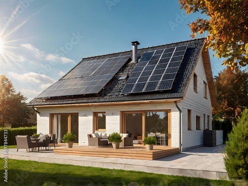 Close-up of a new suburban house with a photovoltaic system on the roof. Simple and modern environmentally friendly house with solar panels on the gable roof, with sunlight during the day