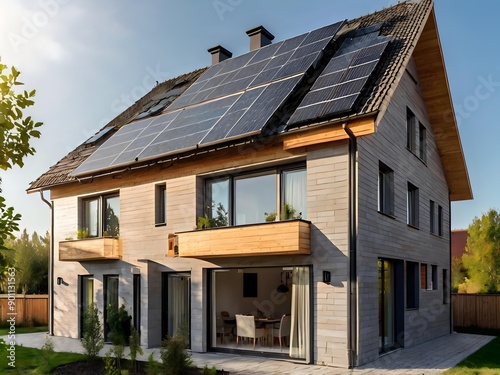 Close-up of a new suburban house with a photovoltaic system on the roof. Simple and modern environmentally friendly house with solar panels on the gable roof, with sunlight during the day