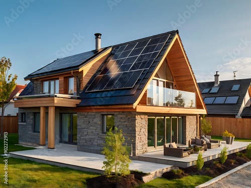 Close-up of a new suburban house with a photovoltaic system on the roof. Simple and modern environmentally friendly house with solar panels on the gable roof, with sunlight during the day
