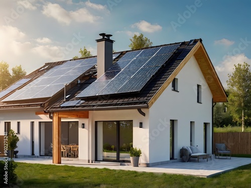Close-up of a new suburban house with a photovoltaic system on the roof. Simple and modern environmentally friendly house with solar panels on the gable roof, with sunlight during the day
