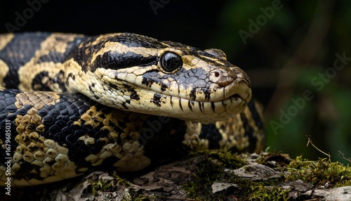 snake, reptile, scale, head, closeup, mossy, log, wild, nature, animal, wildlife, portrait, sharpened, detail, pattern, texture, black, yellow, beauty, snake